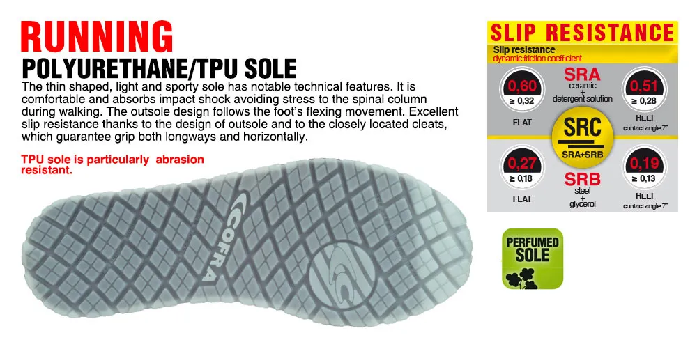 FOOTBED: COFRA SOFT ESD, made of scented polyurethane, holed, anatomic, with low electric resistance, soft and comfortable; the shape of the bottom part guarantees impact energy absorption; the upper part absorbs moisture and keeps the foot dry