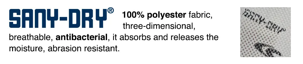 INTERNAL LINING: SANY-DRY® 100% polyester fabric, three-dimensional, breathable, antibacterial, it absorbs and releases the moisture, abrasion resistant