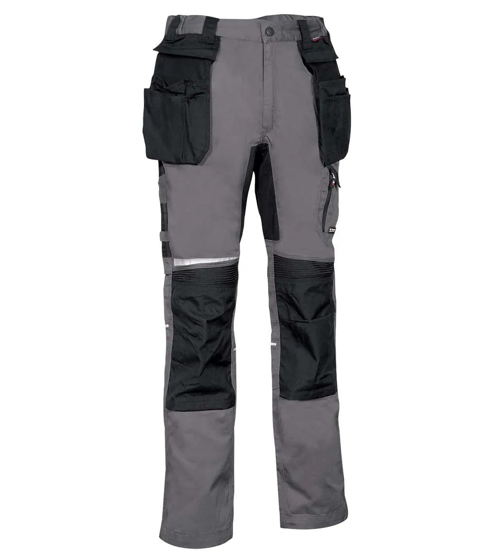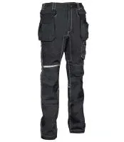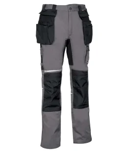 DESCRIPTION: crotch and back part made of stretch fabric to grant maximum freedom of movement, double back pocket one of them with flap closed with velcro, hammer loop, knee and leg ergonomic design, nylon adjustable kneepad pockets, nylon external nail pockets, detachable with zip, reflex inserts, ribbed stretch knee insert granting flexibility of movement, rule pocket, side pocket with double opening (with velcro and zip closure), waist with internal elastic band, wide front pockets