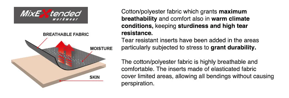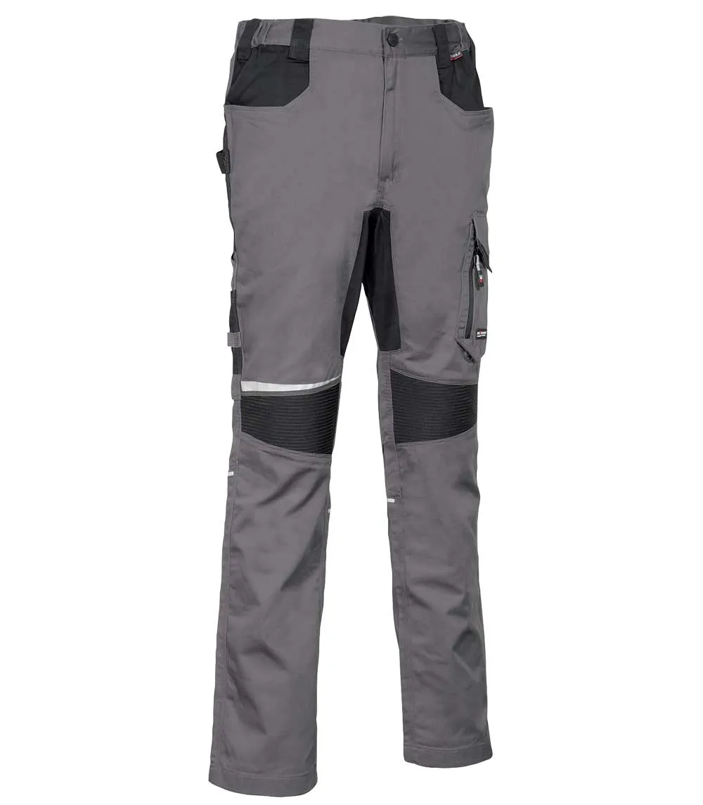 DESCRIPTION: crotch and back part made of stretch fabric to grant maximum freedom of movement, double back pocket one of them with flap closed with velcro, hammer loop, knee and leg ergonomic design, reflex inserts, ribbed stretch knee insert granting flexibility of movement, rule pocket, side pocket with double opening (with velcro and zip closure), waist with internal elastic band, wide front pockets