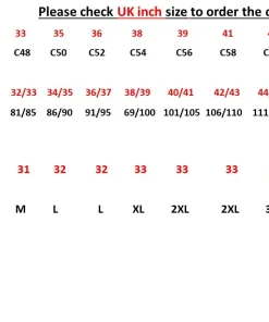 SIZE LONG: L48-L54 ( EU), L42-48 (E), L42-48 (F), 94-106 (D) , C148-C154 (Scandinavian Sizes), L33-L38 (UK)